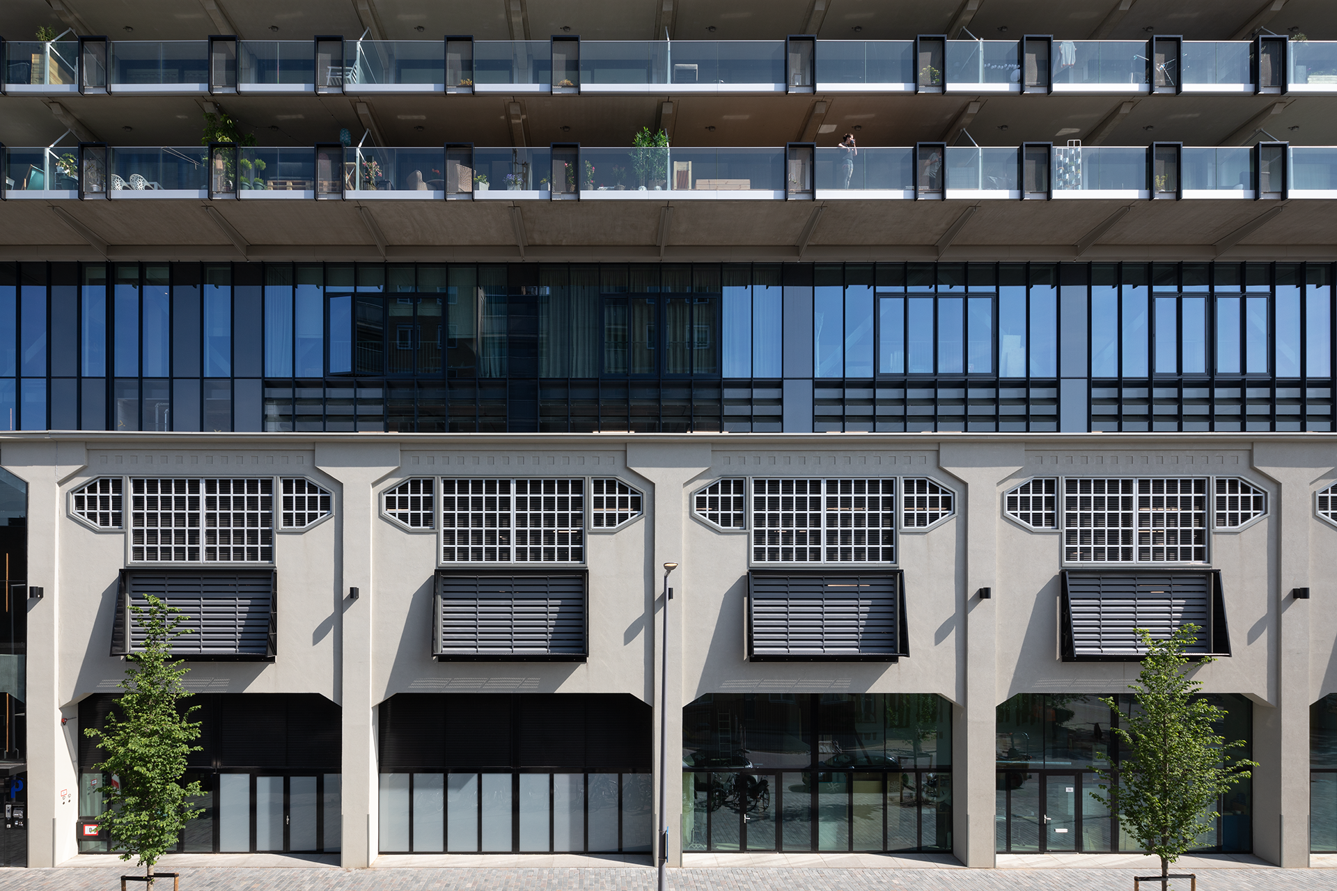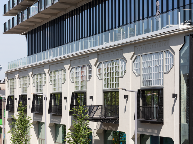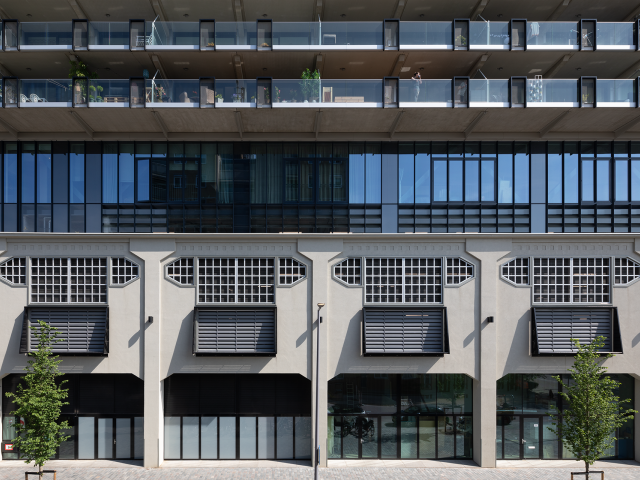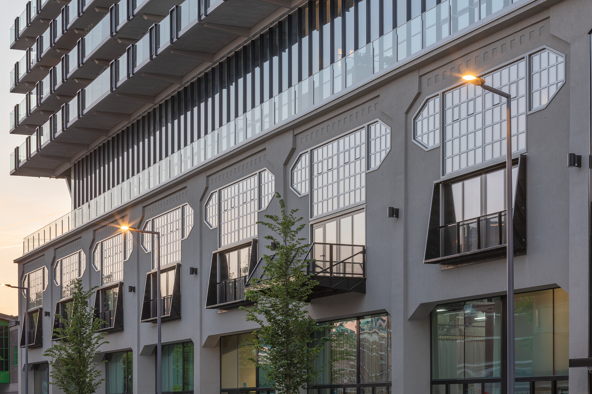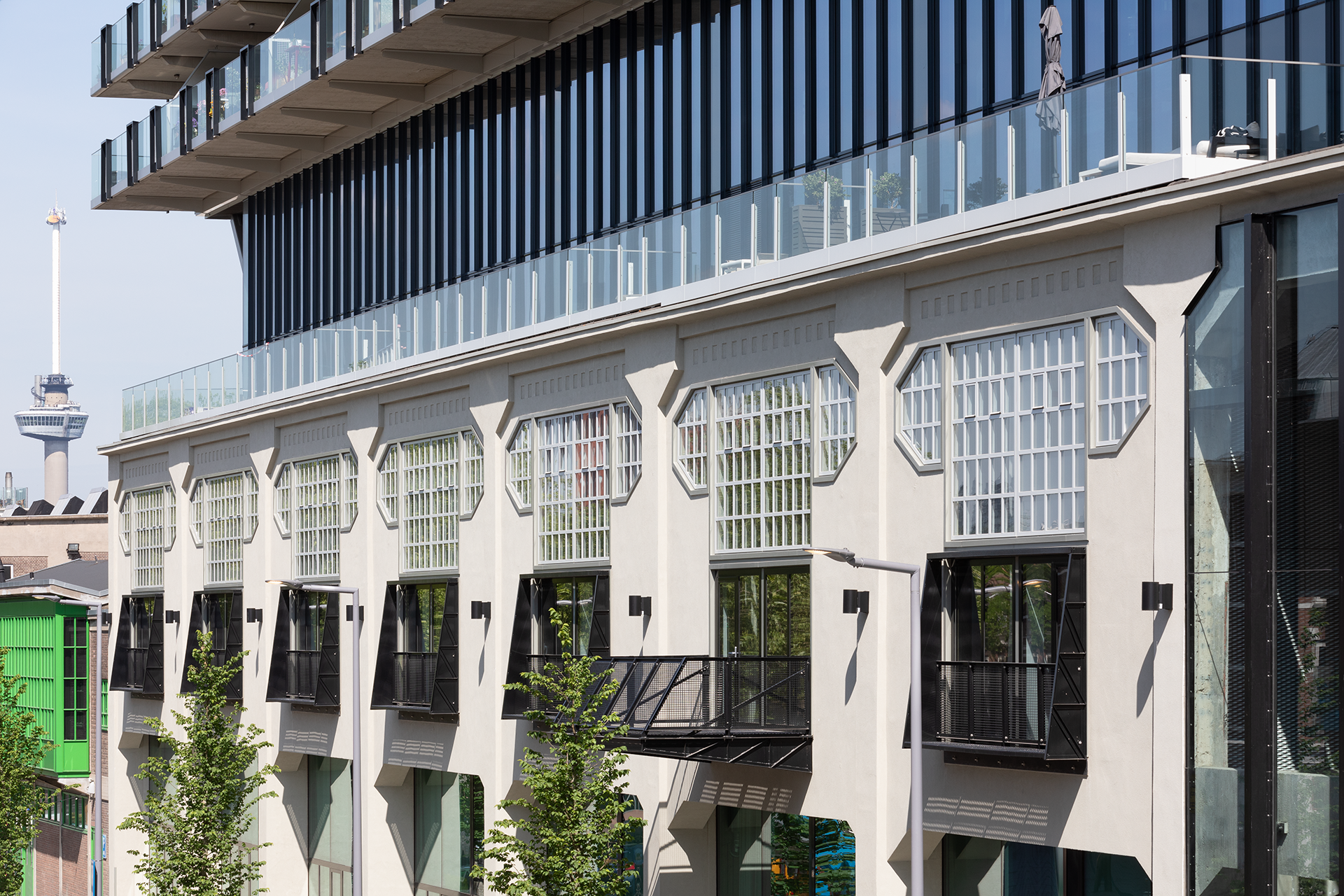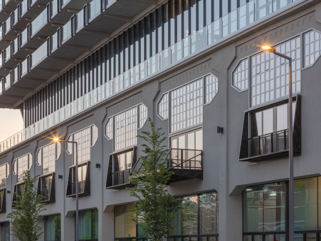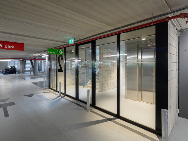 De gehele onderzijde (originele loods) is voorzien van slanke stalen Forster Unico/Unico XS ramen, deuren en vaste puien. Deze passen esthetisch perfect bij het jaren '20 gebouw en geven het dat stukje klassiek moderne look mee aan het bijna 100 jaar oude gebouw. Daarnaast zijn de de Forster systemen ook toegepast daar waar brand- en vluchtveilige eisen zijn. O.a. ter plaatse van brandcompartimenten en de parkeergarage.