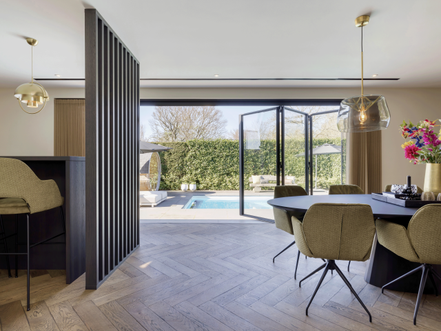 Deze unico schuif-vouwwand is de perfecte, naadloze overgang tussen binnen en buiten. Combineert de wand functionaliteit en esthetiek: hij biedt flexibiliteit in gebruik zonder concessies aan het ontwerp.