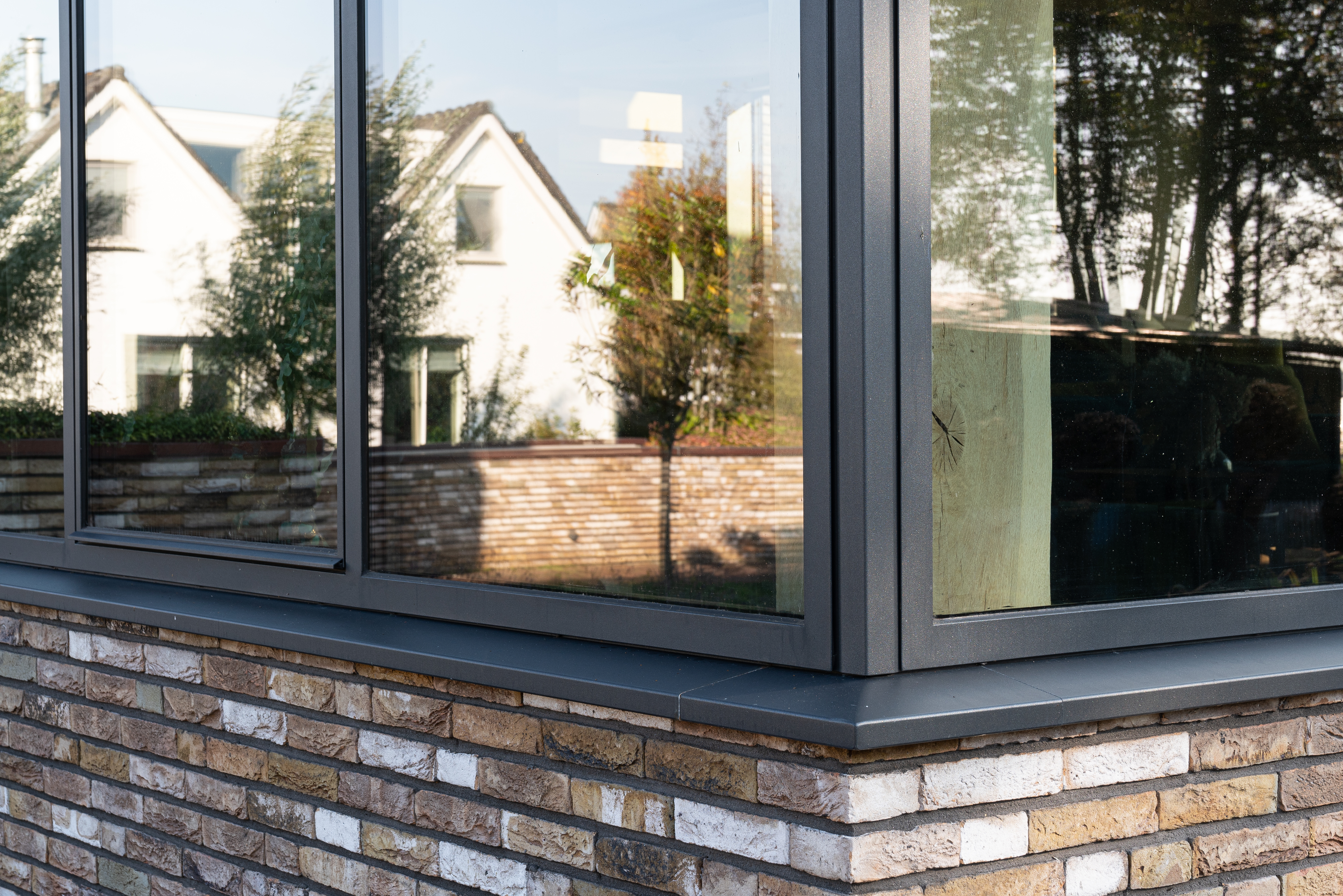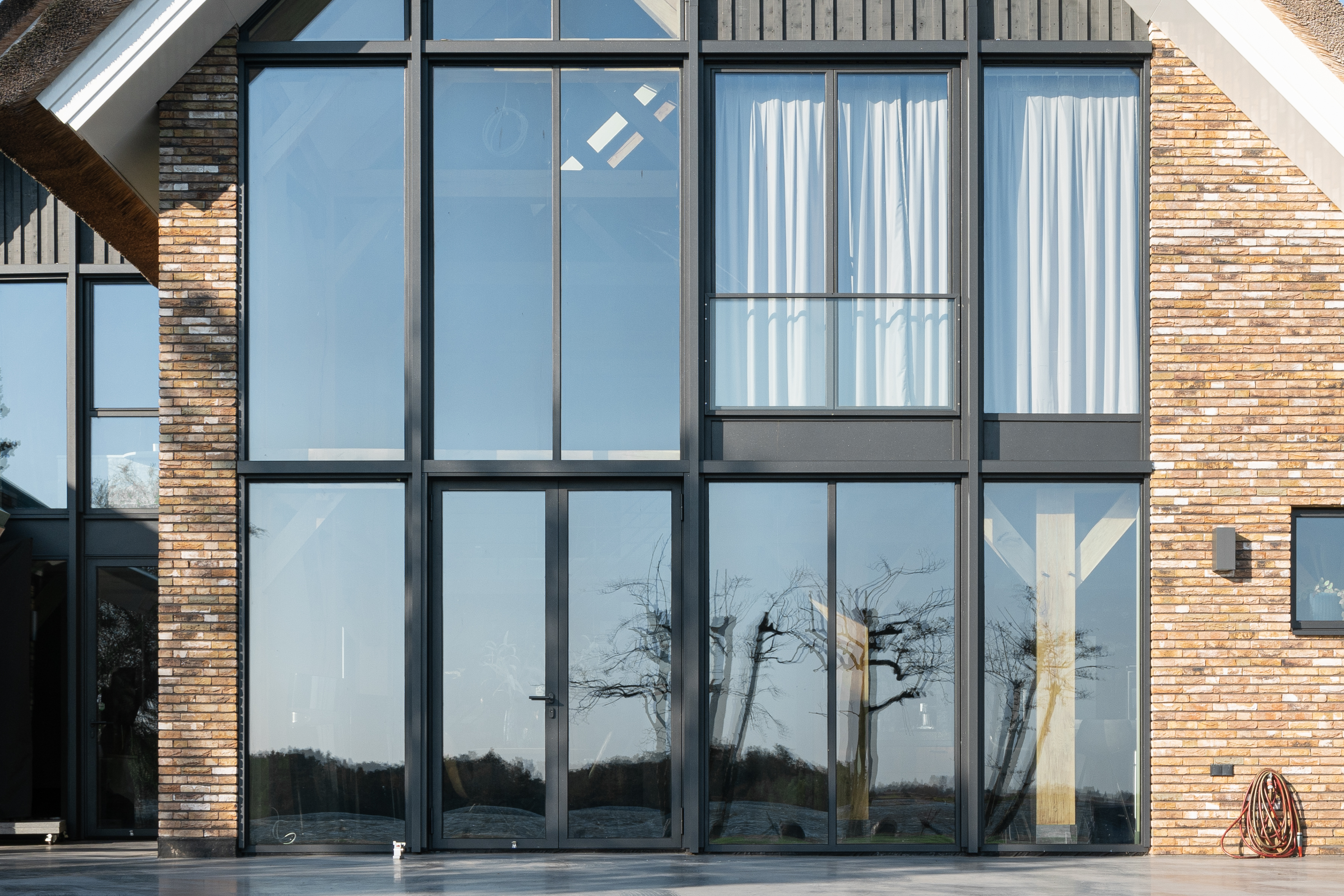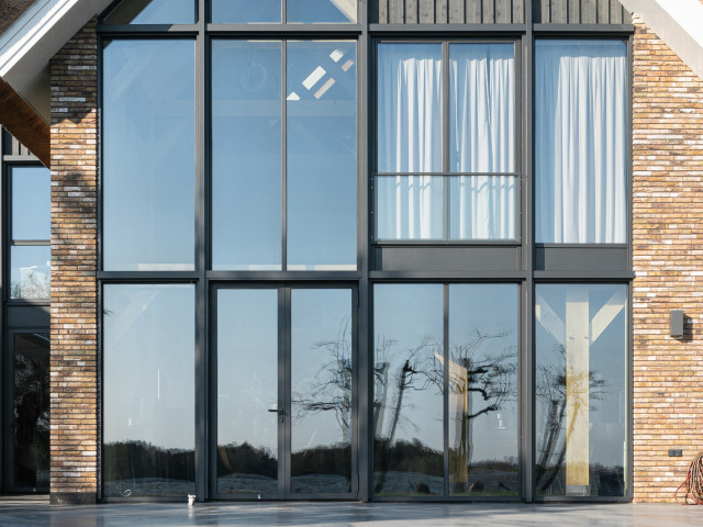 De industriële stalen profielen in antracietkleur, in combinatie met landelijke materialen zoals een rieten dak, houten panelen en de ruwe bakstenen maken het buitenaanzicht tot een modern geheel waarin diverse stijlen feilloos met elkaar gecombineerd worden.