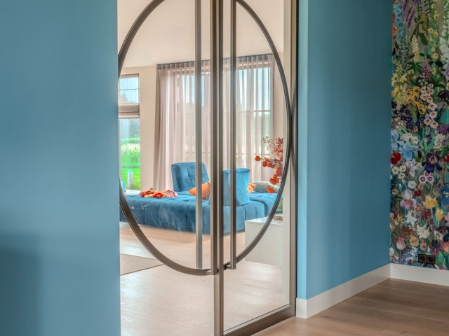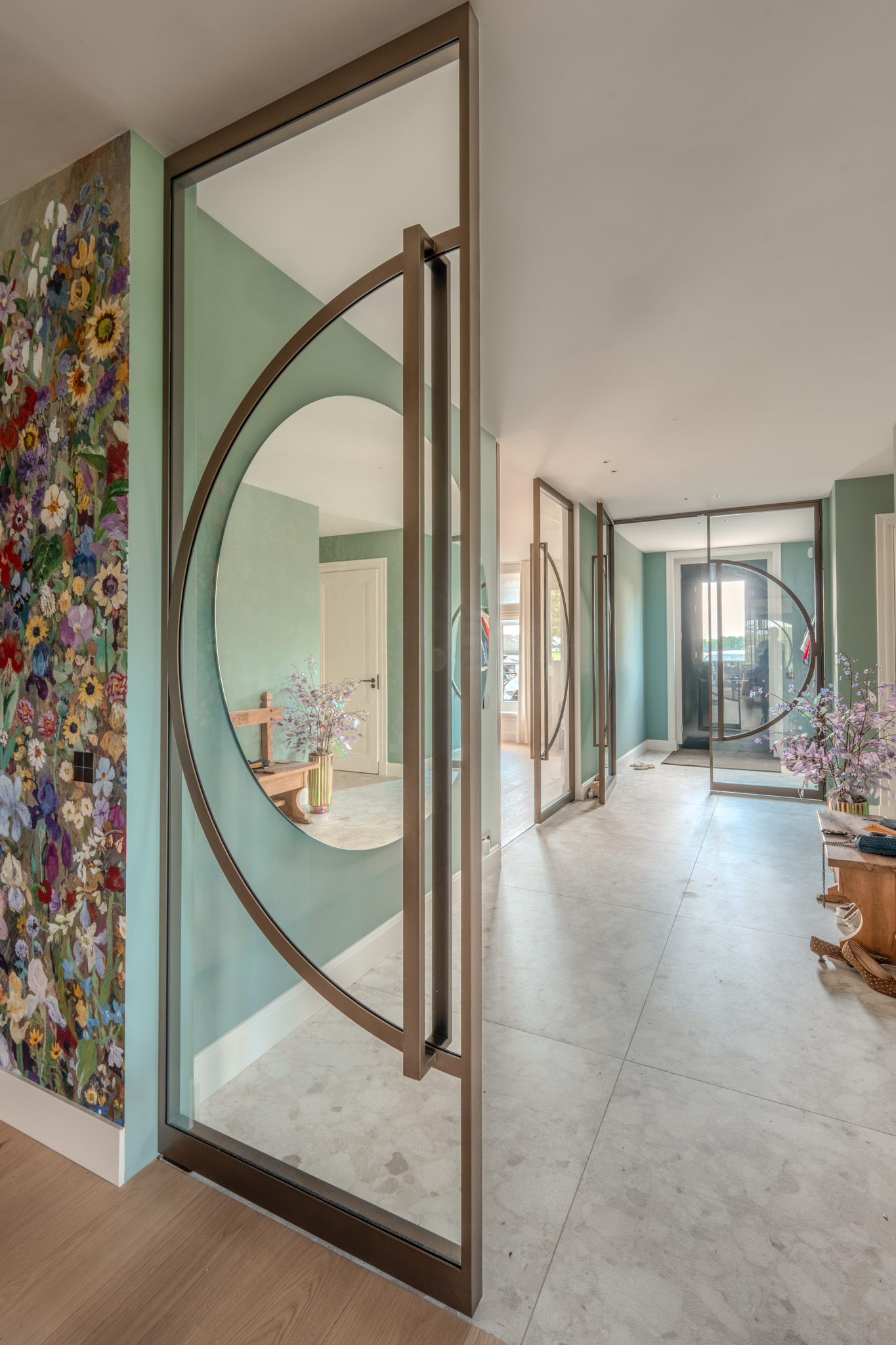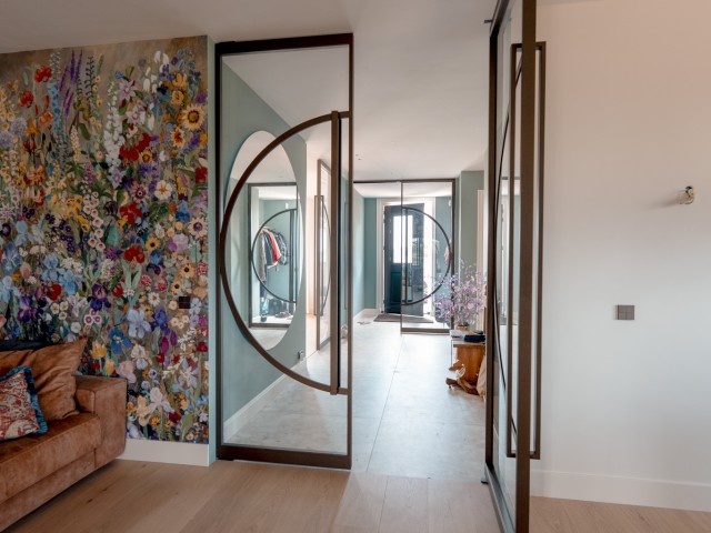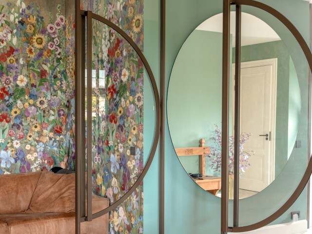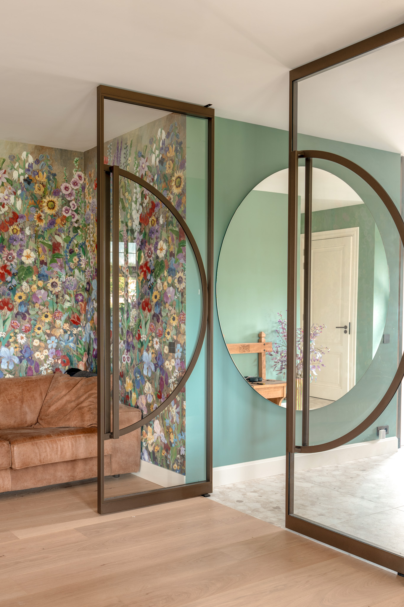 De deuren vormen een subtiele overgang tussen twee werelden. Enerzijds de ingetogen rust van hout, licht en glas; anderzijds de expressieve bloemenwand - een balans die dit interieur zijn eigen identiteit geeft.