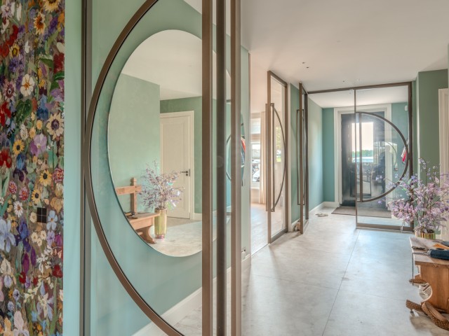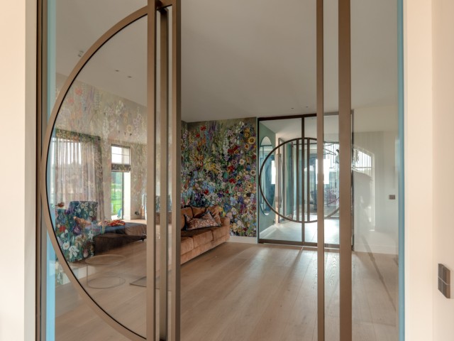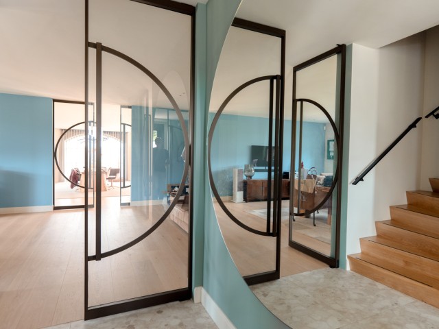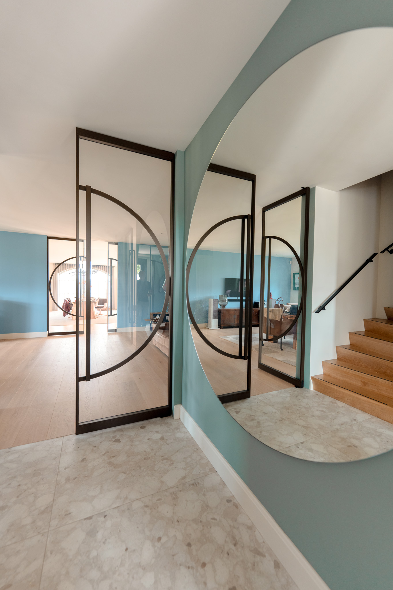 De dubbele deuren bestaan uit een strak bronzen kader, gevuld met transparant glas. De geometrische lijnen worden doorbroken door een grote cirkel, die beide deurpanelen met elkaar verbindt. Dit gebaar maakt het openen van de deuren tot een ritueel: je stapt niet zomaar een andere ruimte binnen, maar betreedt een nieuw toneel.